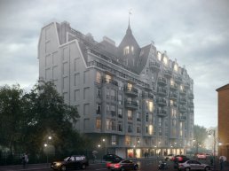 Новый дом располагается в недалеко от Каменноостровского проспекта. Дизайн постройки выполнен в стиле модерн. Фасад комплекса украшен множеством декоративных элементов и имеет уникальный дизайн. Ещё одна особенность дома - витражное остекление и литые ограждение балконов. Отдельного внимания заслуживает готическая башенка с флюгером, расположенная на крыше дома.
