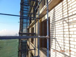 На текущий момент на стройплощадке ЖК «Консент» ведутся активные работы по возведению наружных стен и облицовке фасадов кирпичом на уровне 10-го этажа.